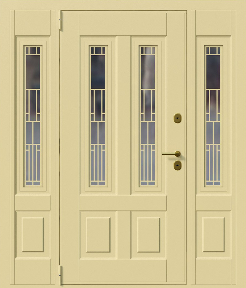 Входная дверь со стеклопакетом и патиной для загородного дома белая №29