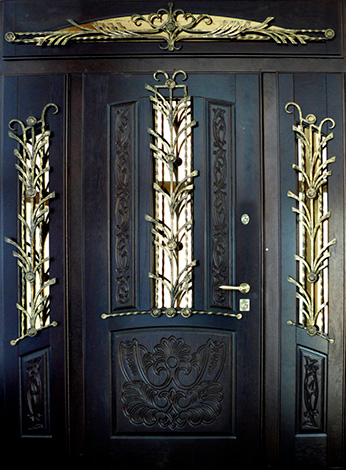 Входная металлическая дверь для частного дома со стеклом и ковкой №29